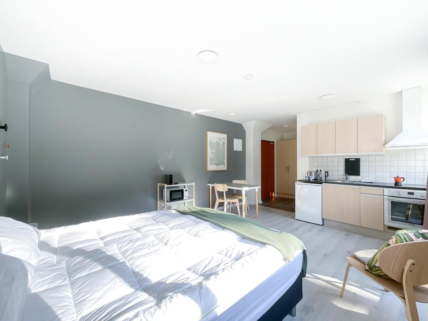 Studio Apartment. This apartment includes 1 living room, 1 separate bedroom and 1 bathroom with a shower and a hairdryer. In the kitchen, guests will find a stovetop, a refrigerator, kitchenware and an oven. This apartment has a washing machine, a coffee machine, a flat-screen TV and a balcony. The unit has 1 bed.