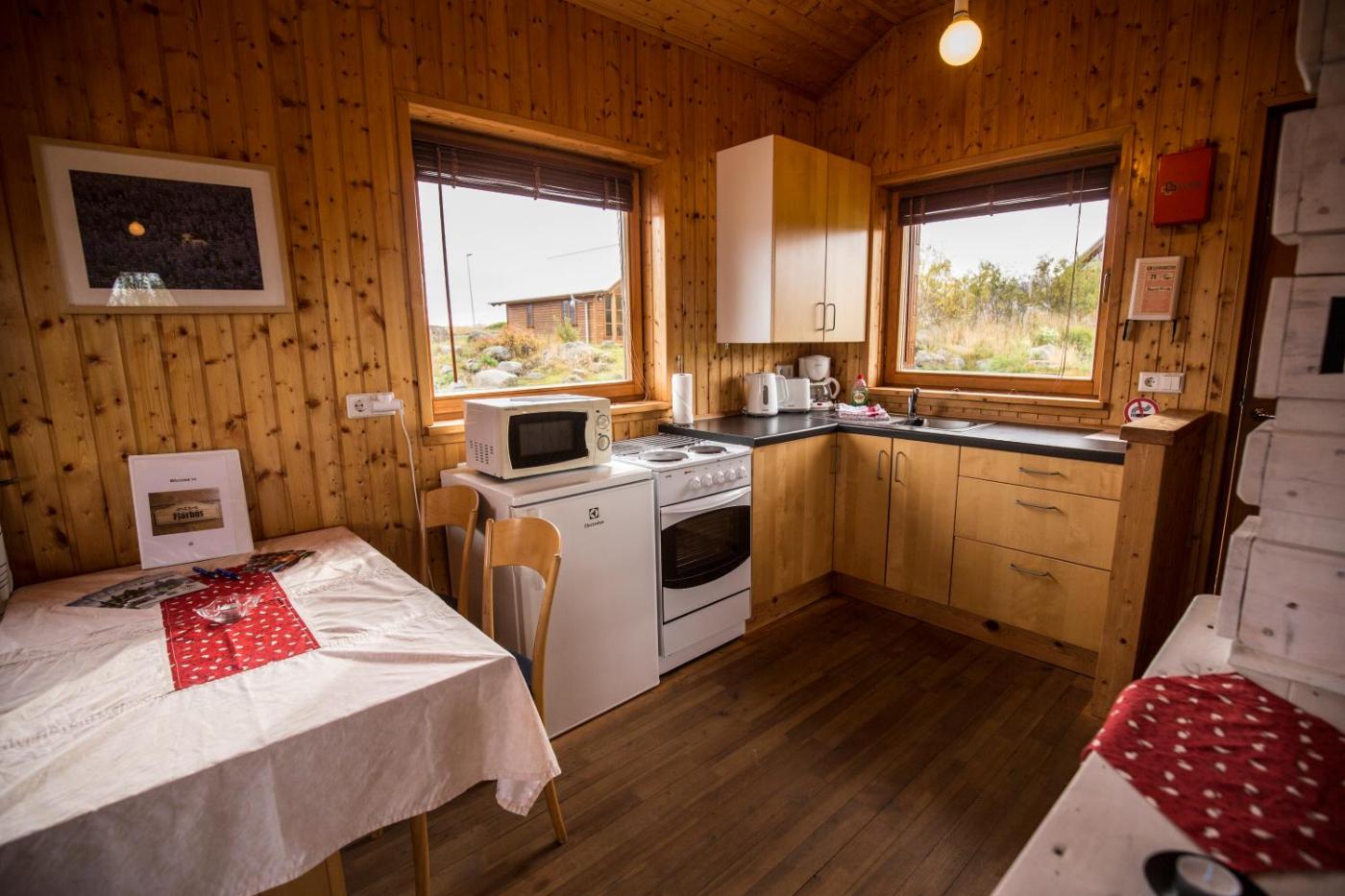 The wooden cottages at Hestasport have microwaves, teacoffee makers and fridges. Dining tables and sofas are also included. Each cottage has a private bathroom with a shower.